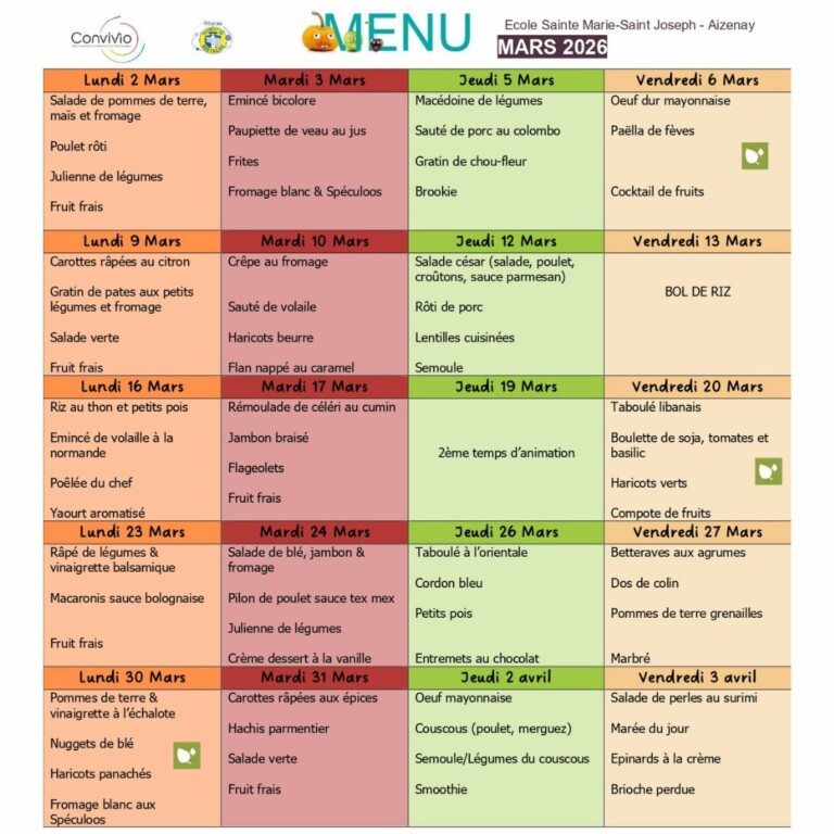 Menus du mois de mars