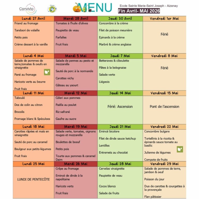 Menus du mois de mai