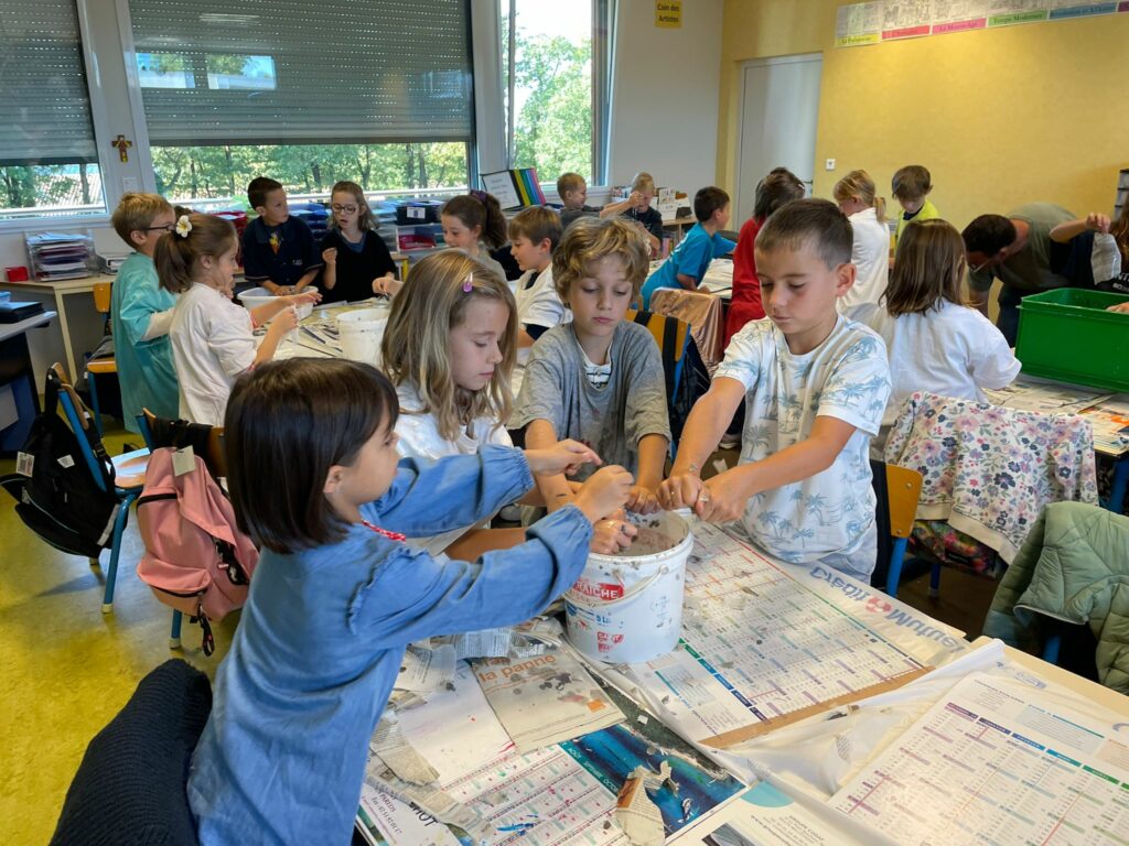 Première étape : déchiqueter des feuilles de papier journal, soigneusement découpées en petites miettes. Ce matériau de récupération a ensuite été mélangé à du plâtre pour obtenir une pâte malléable. Chaque élève a utilisé cette pâte pour recouvrir un support recyclé, donnant ainsi forme à leur création. Un travail manuel riche en découvertes, qui mêle imagination, patience.